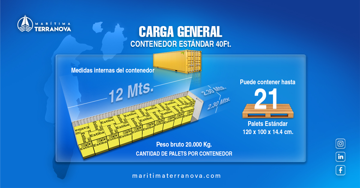 En un contenedor de 40 pies caben hasta 21 pallets estándar o 25 Euro pallets. Si se trata de un contenedor 40 pies High Cube, puede llegar a contener hasta 44 pallets, si se apilan en dos niveles.