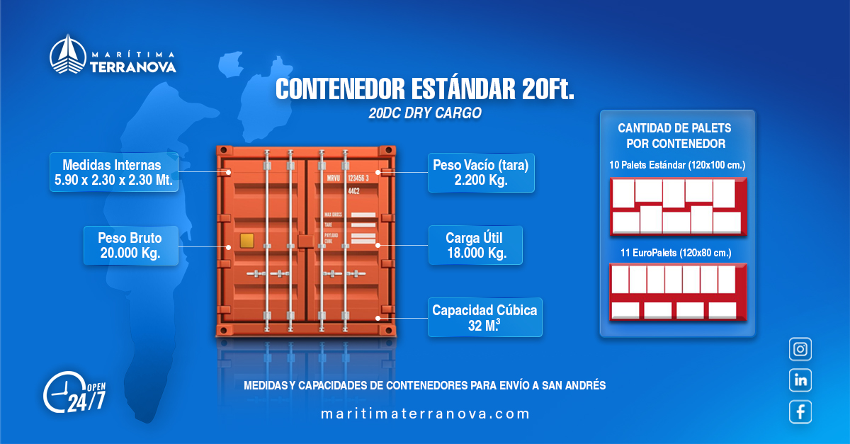 El peso máximo permitido en los puertos de San Andrés y Providencia es de 20 toneladas por contenedor, tanto para 20 como para 40 pies. Esta restricción está relacionada con la infraestructura del muelle y debe ser considerada en la planificación logística.